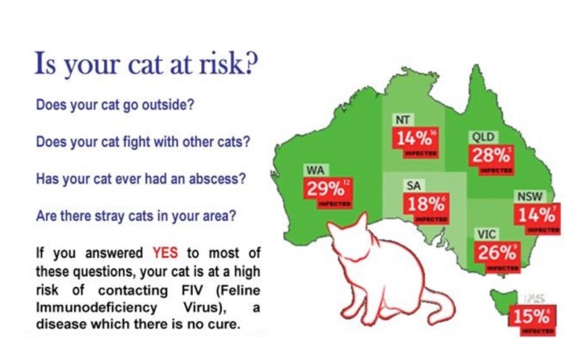 Feline Immunodeficiency Virus (FIV) is an immune-suppressing virus affecting cats. It is spread from cat to cat, mostly from fighting wounds, as the virus is present in the saliva. It is a slow acting virus and an infected cat may not show symptoms for years. Infected females will always give birth to infected kittens. Symptoms are many and varied, because the virus enables various other diseases to take over the body, and the symptoms depend on what other diseases FIV has allowed to get out of control. FIV is in the feral cat population around Gayndah. Any cat that gets in a fight with any other cat is at risk of being infected with FIV. Entire (not desexed) male cats are at higher risk of contracting FIV due to their tendency to go walkabouts and fight with other cats.