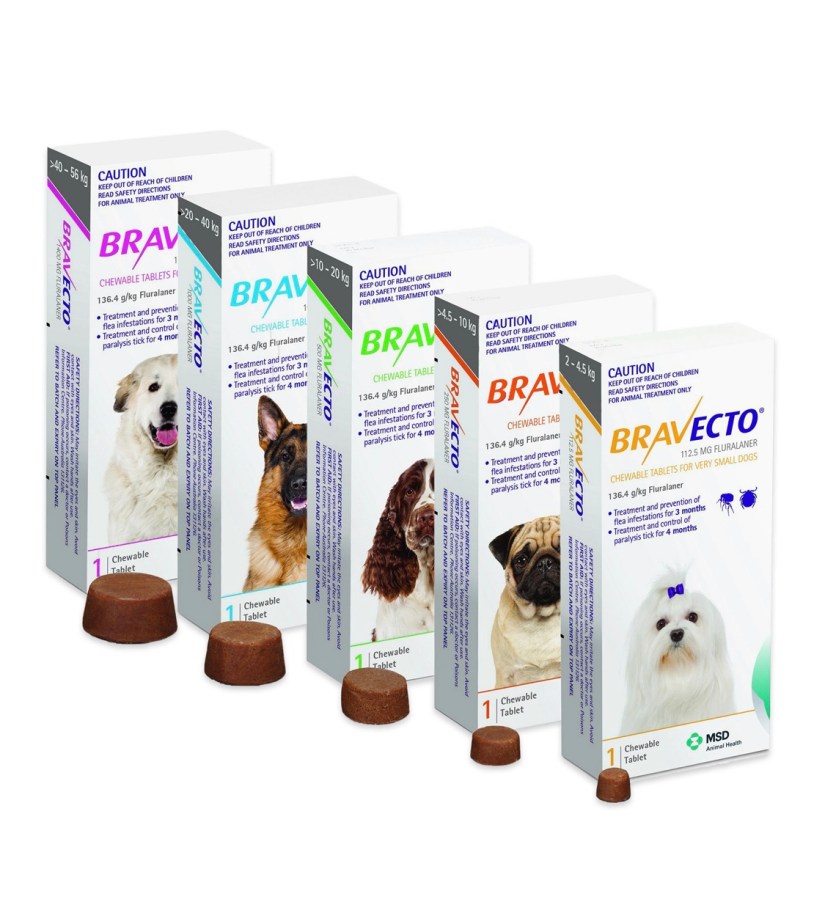 BRAVECTO! These chewable tablets will kill fleas on your dog for 3 MONTHS! All over red rover! Most dogs will eat these tablets as a treat. Bravecto protects against paralysis ticks for 4 MONTHS and is no more expensive per month than any of the other monthly tablets out there.